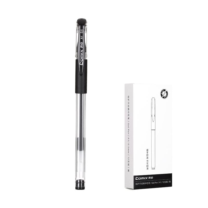 > 齐心 A1 软护手拔帽中性笔 子弹头0.5mm 黑 12个装