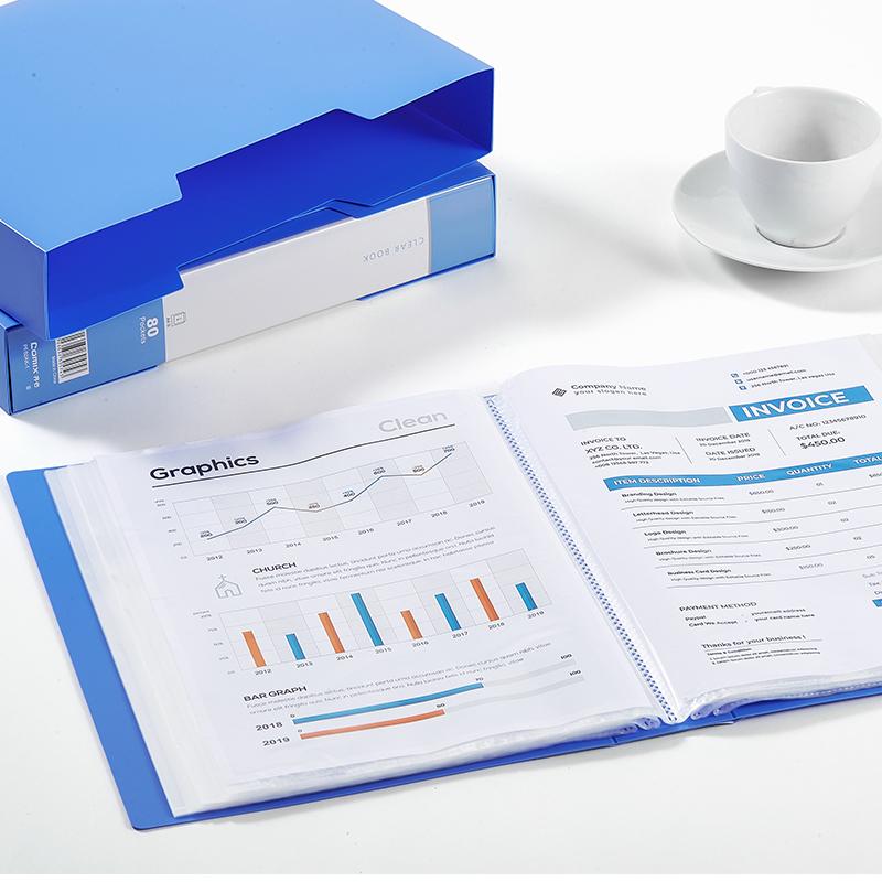 齐心 PF80AK-1 大容量资料册 带外壳 A4 80袋 蓝 单位:个