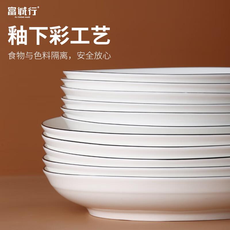 富诚行 黑边陶瓷饭盘菜碟 10只装 20cm 7英寸直径18cm 单位:组